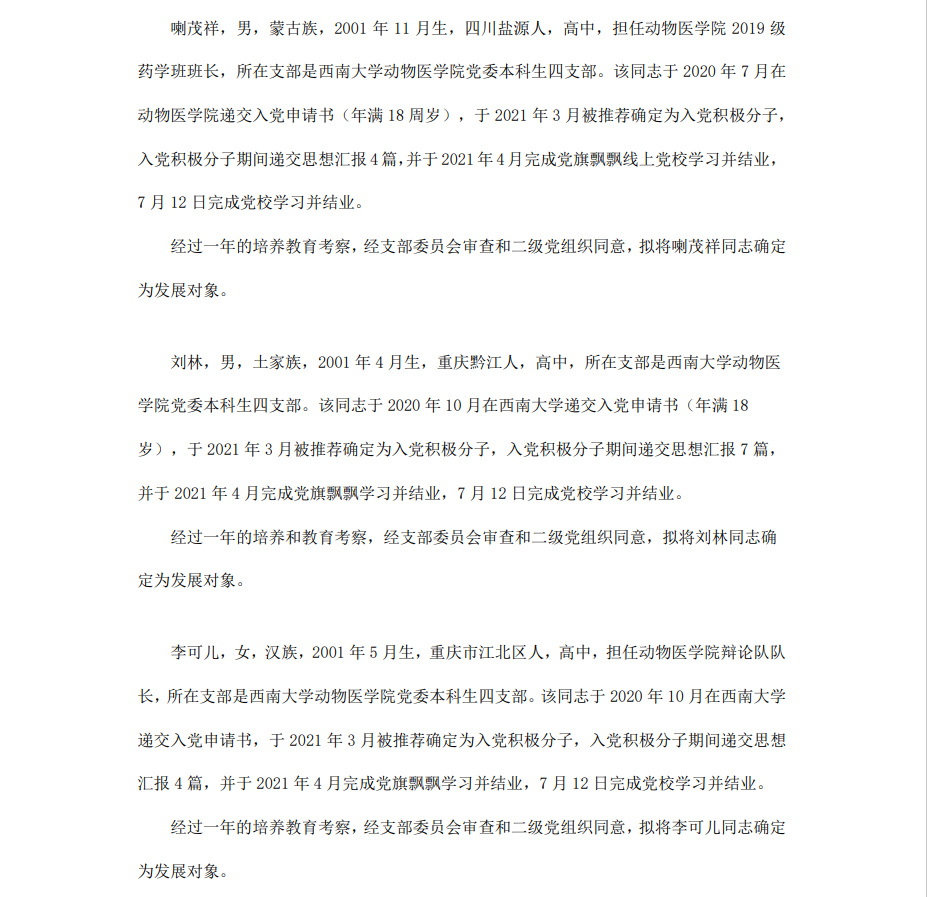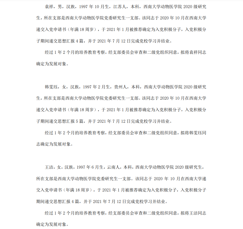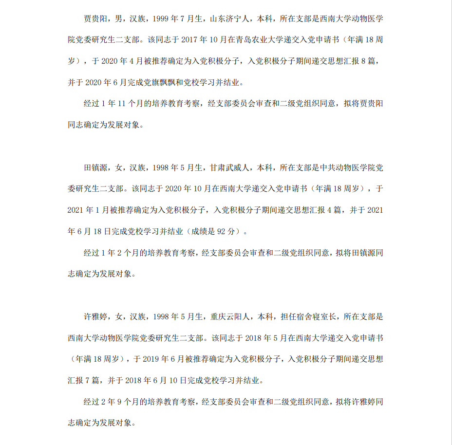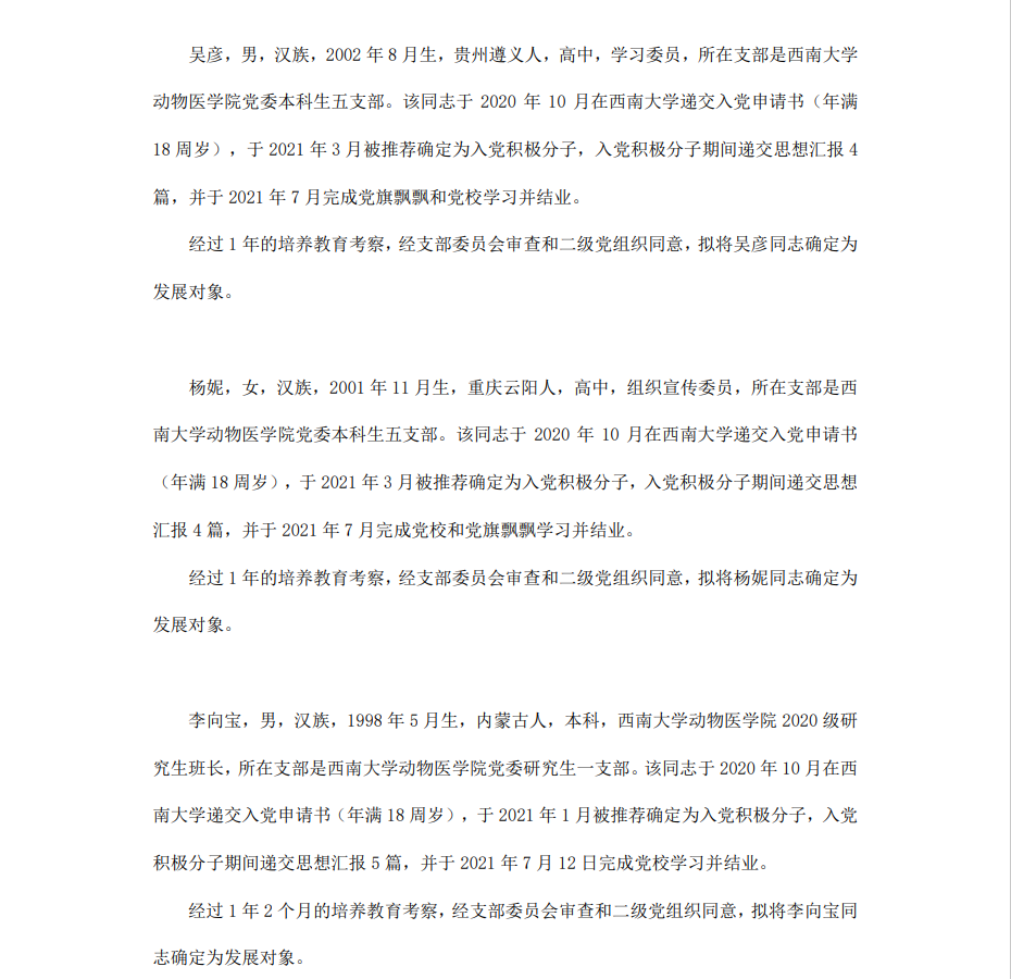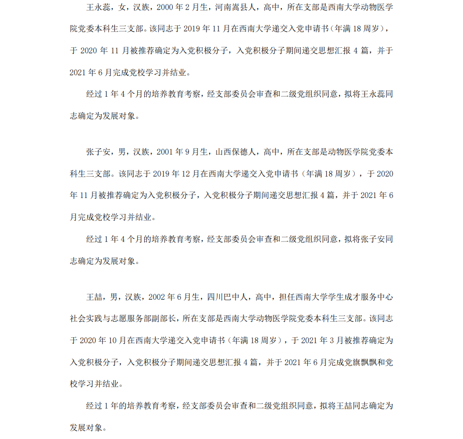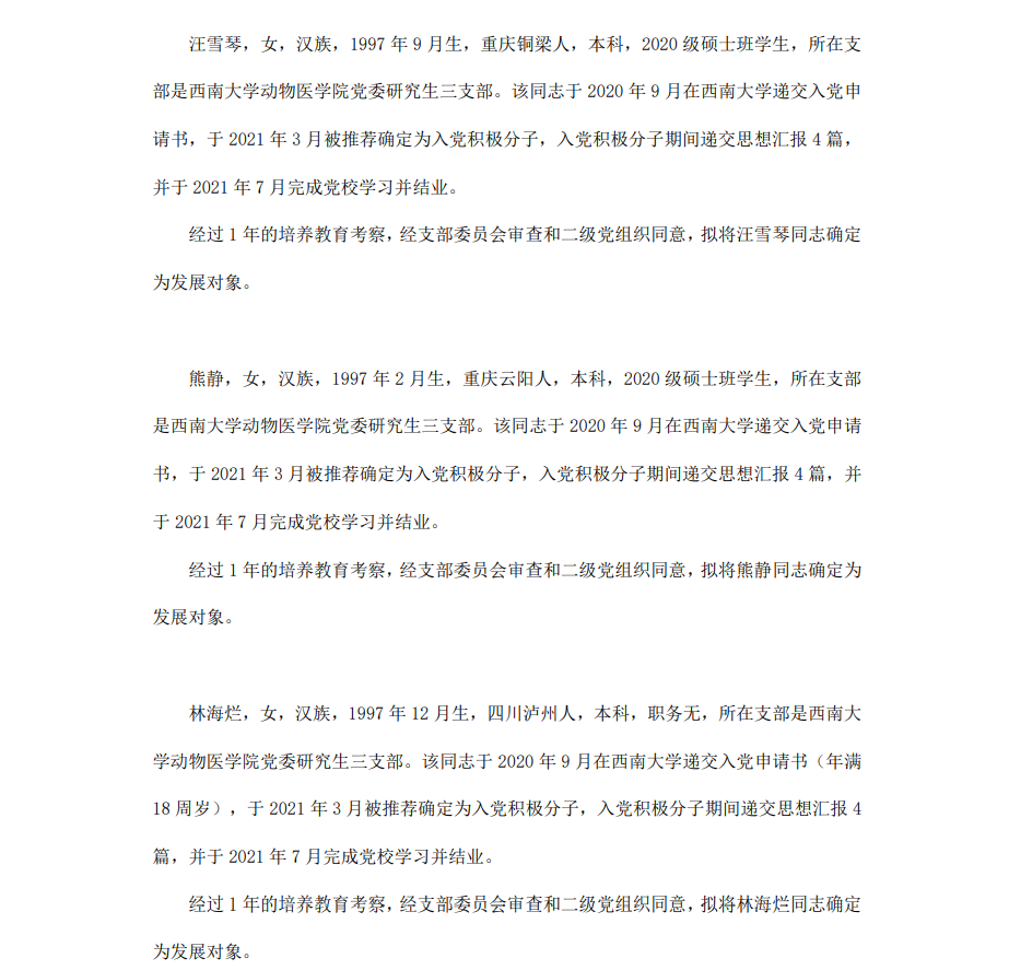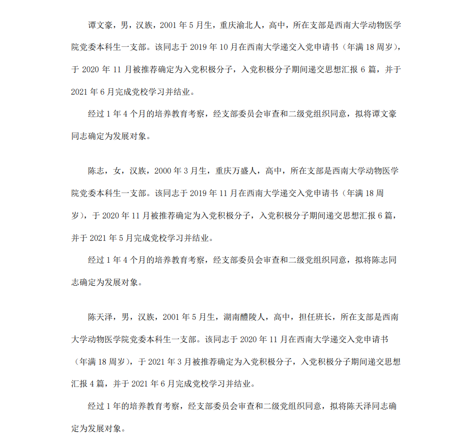 根据《中国共产党章程》、《中国共产党发展党员工作细则》和《西南大学发展党员工作实施细则》精神,经各团支部提名推荐,在征求党内外群众意见和党支部考察基础上,中共PA视讯集团委员会讨论,拟定龙潜等49名同学为近期发展对象,现将其基本情况予以公示。