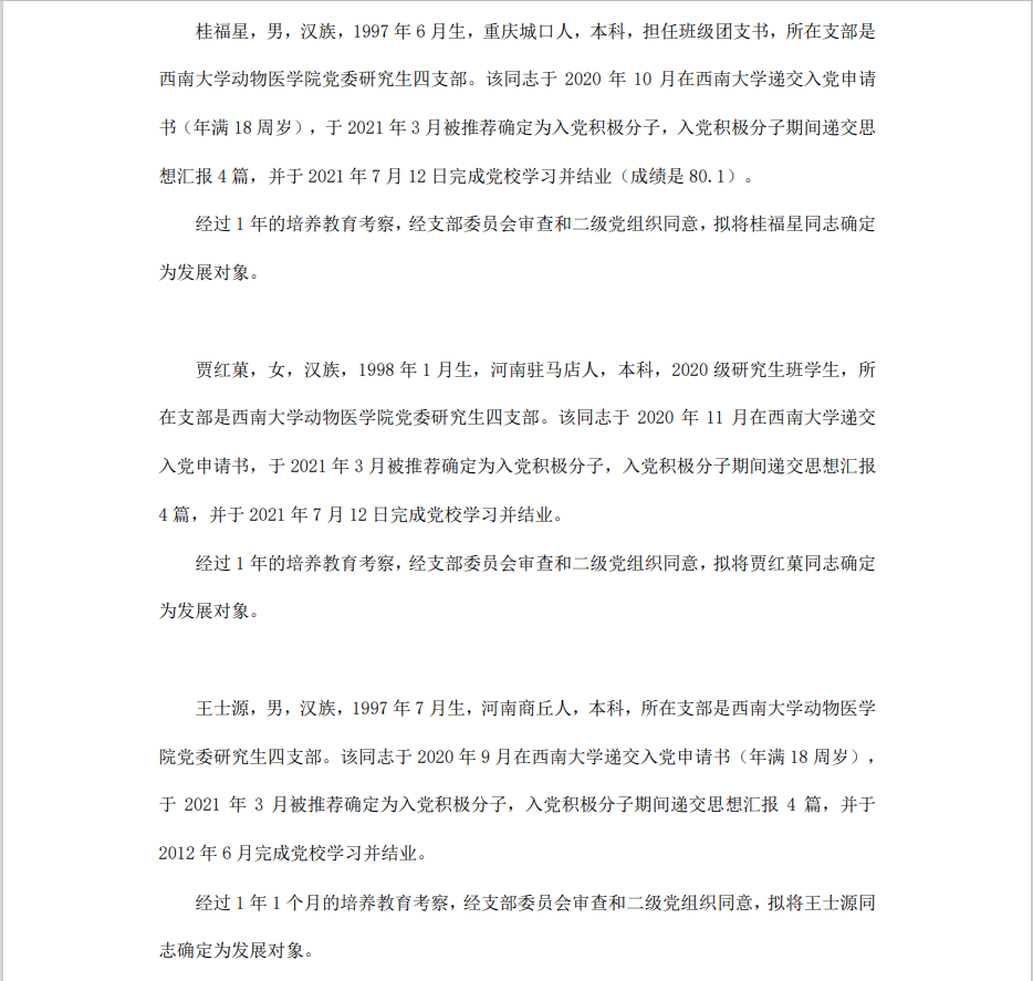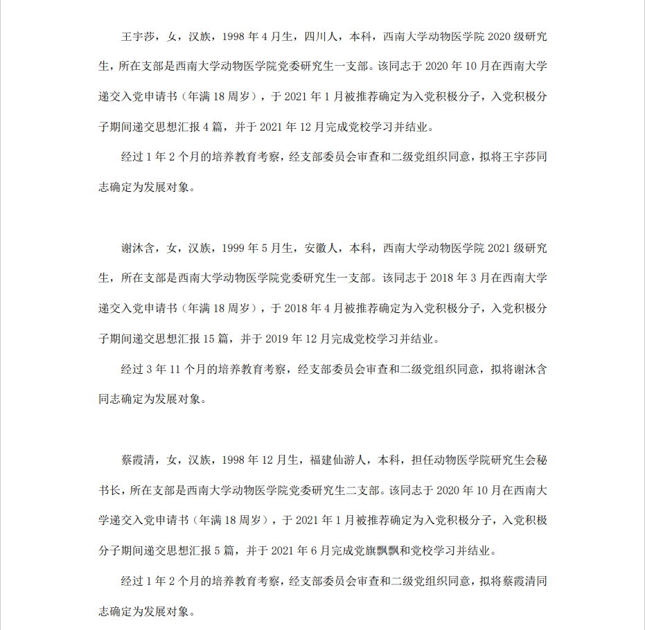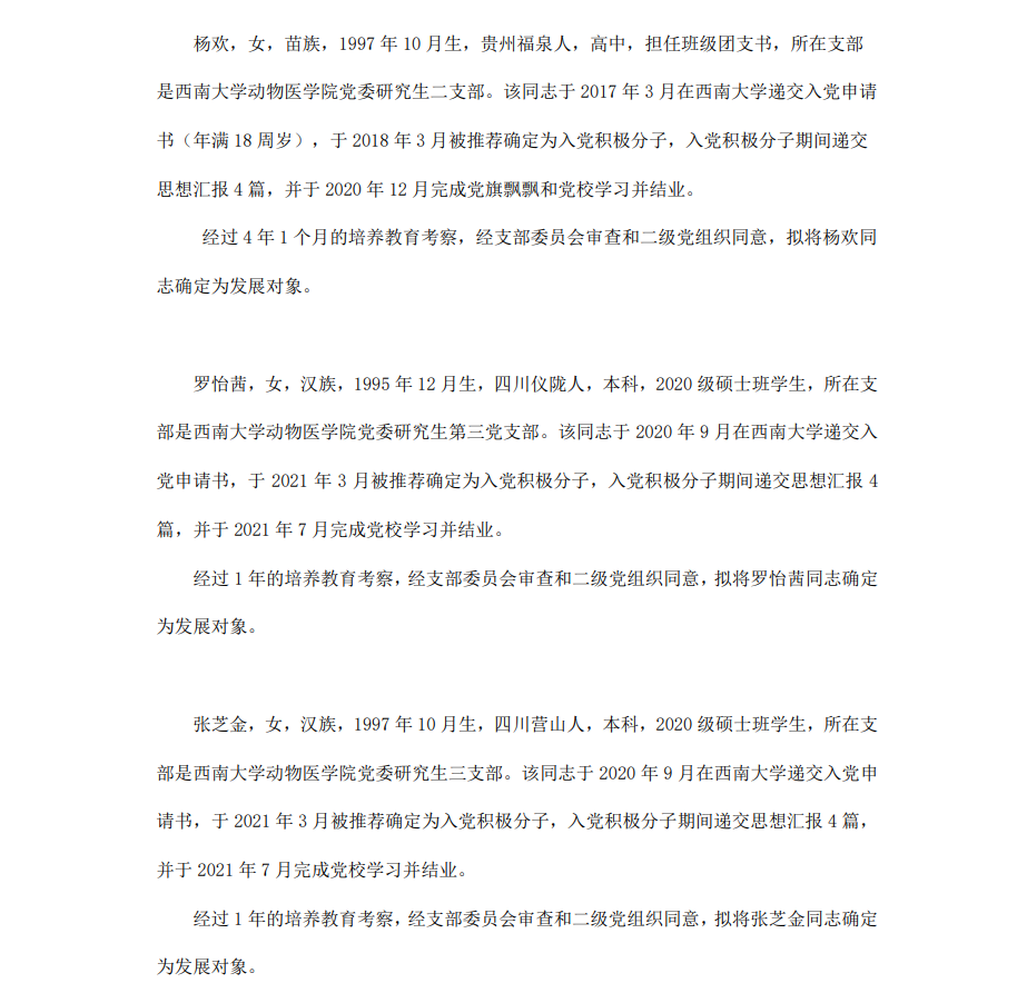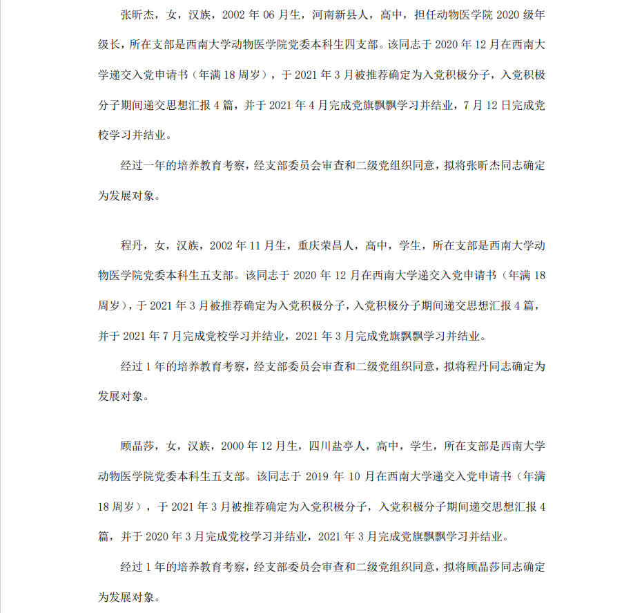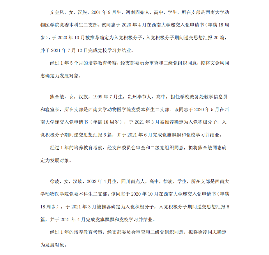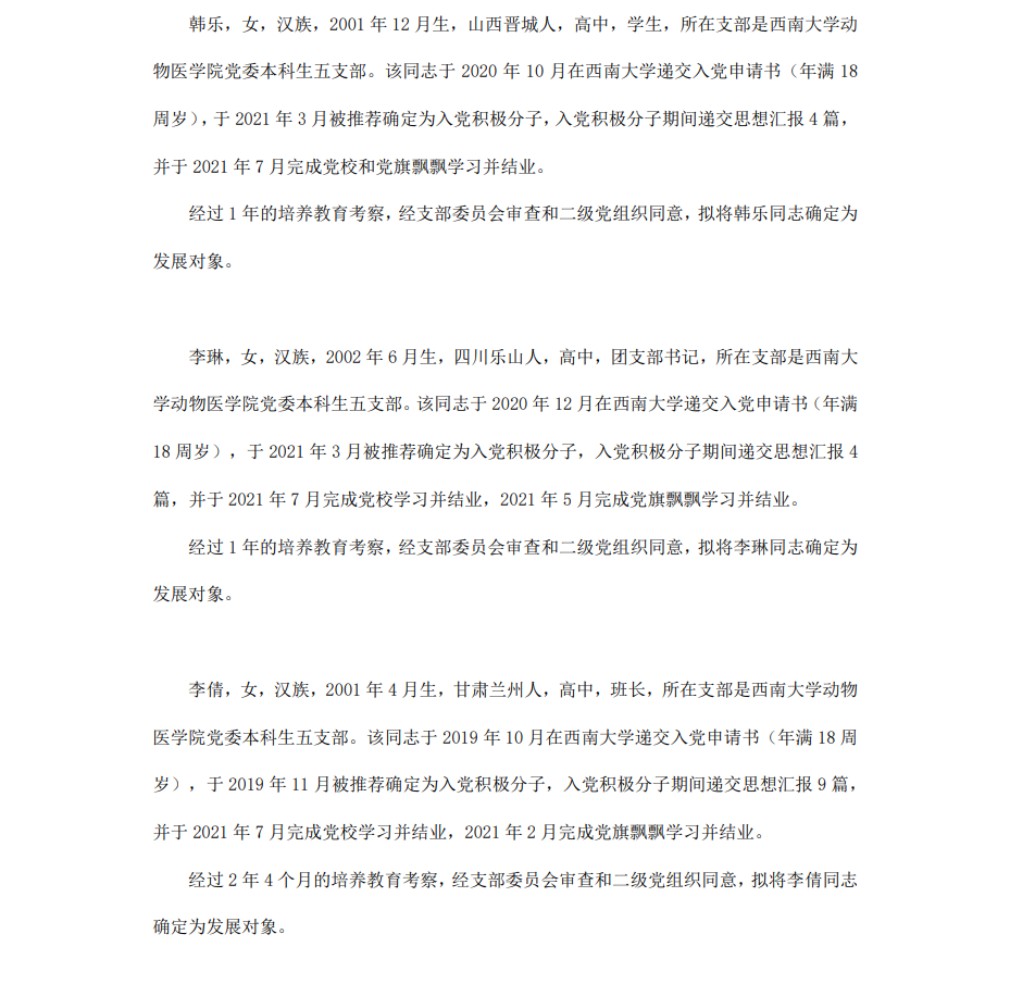 根据《中国共产党章程》、《中国共产党发展党员工作细则》和《西南大学发展党员工作实施细则》精神,经各团支部提名推荐,在征求党内外群众意见和党支部考察基础上,中共PA视讯集团委员会讨论,拟定龙潜等49名同学为近期发展对象,现将其基本情况予以公示。