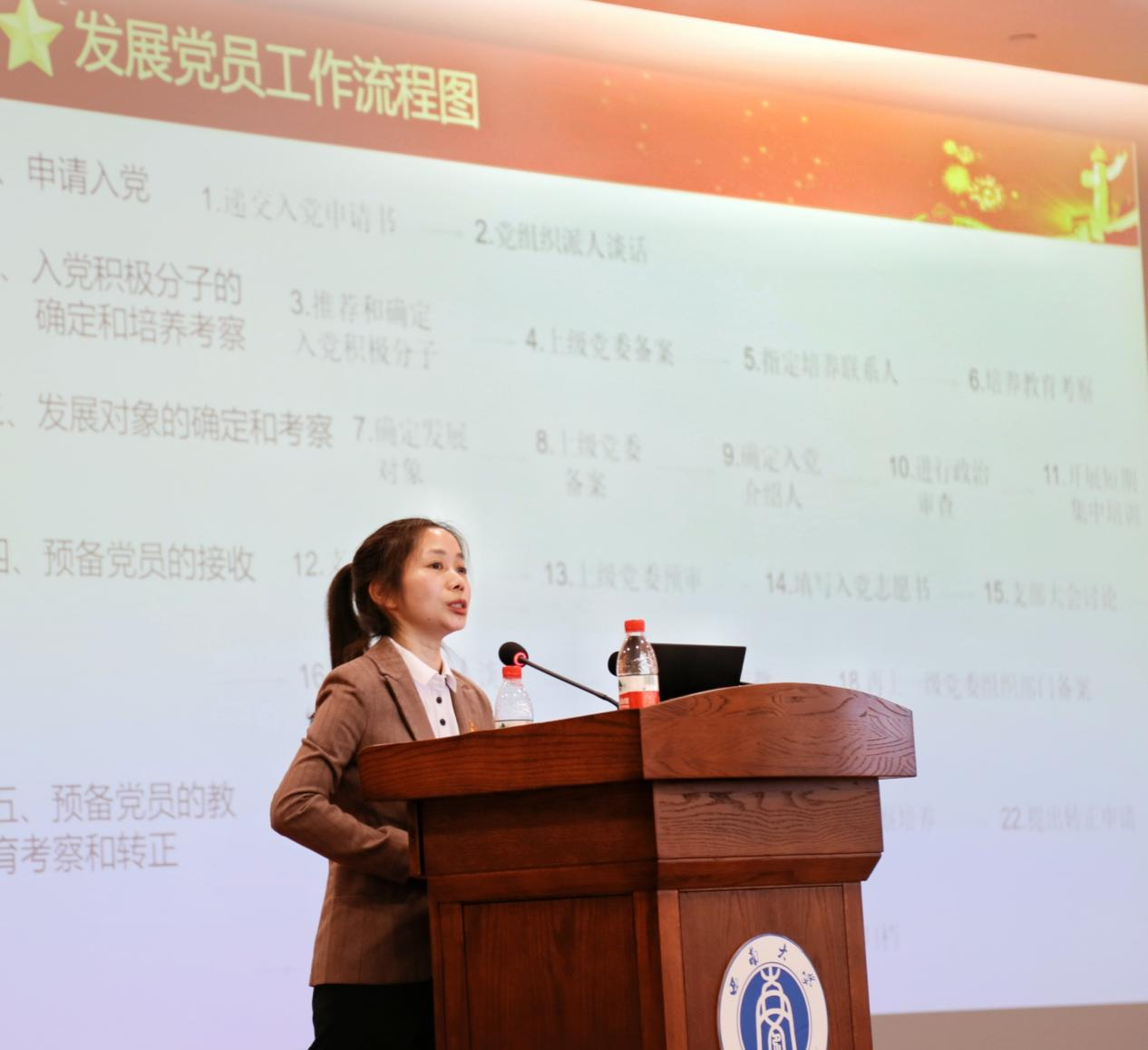 组织员杨银琼为新生详细讲解了入党流程和注意事项,包括入党申请、积极分子、发展对象、预备党员各个阶段的注意事项,向新生们讲解了入党申请书、思想汇报的格式要求、常见问题;并介绍了学院本科生党支部设置和驻班党员情况。