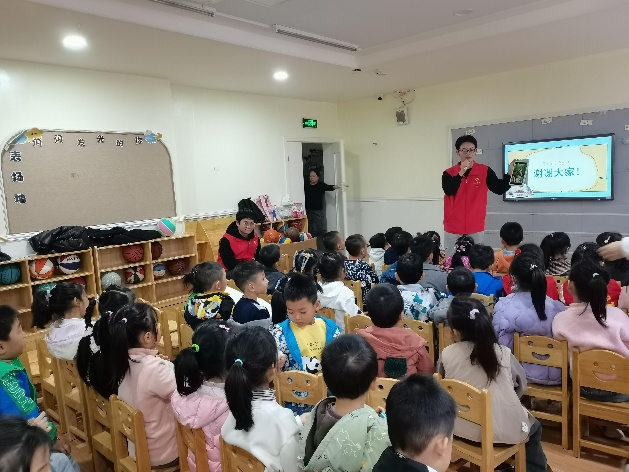 活动前期,康成静同志以PPT与卡通短片相结合的形式,向幼儿园小朋友普及宠物健康饲养、突发情况应急处理、文明养宠等相关知识和注意事项。活动中期,进行了有奖问答环节,小朋友们一起回答问题,党员同志给小朋友们贴上小红旗贴纸,现场气氛达到了高点。活动尾声,王国康同志与小朋友们积极互动,讲述《汪汪队立大功》里的犬类原型和相关知识,其余同志为小朋友们送上学习用具,鼓励小朋友们提高宠物饲养能力,在与宠物日常相处中保护自身以及宠物的健康安全,传递带有知识力量的冬日温暖。