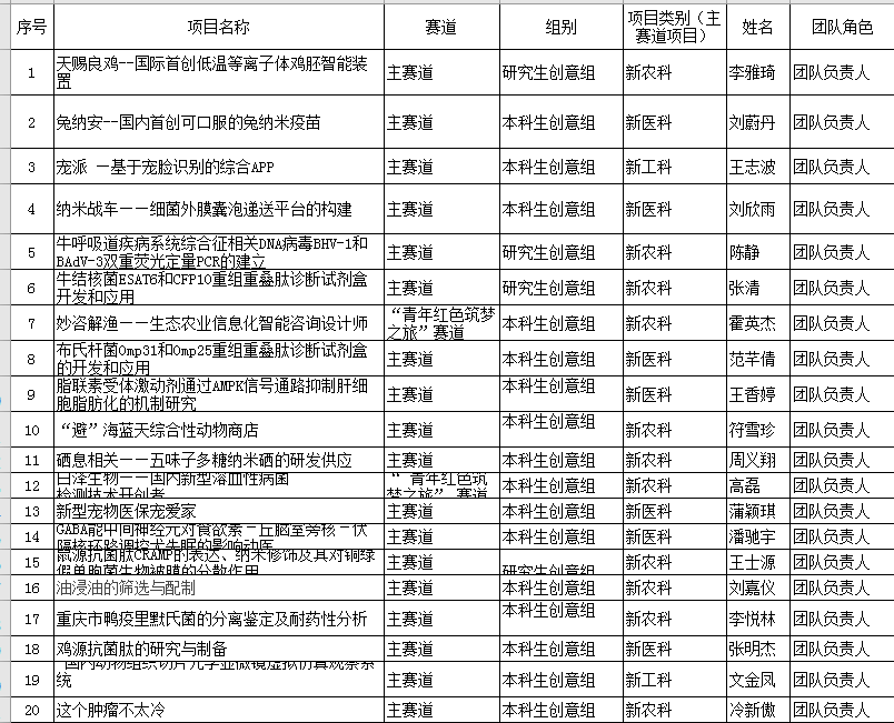 根据学院《2022年“互联网+”大学生创新创业大赛选拔赛》的通知要求,学生自愿报名,专家已评审出前20名参赛团队。名单如下: