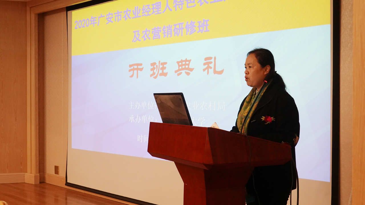 刘娟院长就西南大学有关情况作介绍。她表示,西南大学对此次培训高度重视,对学习地点、住宿条件等作了详细安排及精心准备,并组织专人部署培训相关事宜,落实知名专家教授进行授课。希望全体学员以此次培训为契机,不断总结经验,在未来学习中加强沟通与交流,共同助推广安农业产业发展并取得新进展。