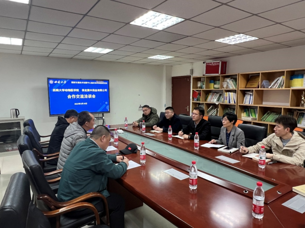 方仁东首先对张志宾副总经理一行的到访表示热烈欢迎,并介绍了学院的基本情况、聚焦的科研领域和相关学科专业发展情况。张志宾介绍了保定冀中药业集团的基本情况,表示企业一直非常重视产品研发与创新,希望能与我院在科研成果转化、产品工艺优化、新兽药联合研发、特别是在防控猪蓝耳病中兽药制剂联合研发方面开展深度合作。随后,双方与会人员就相关技术人才需求、科研成果转化、助推兽药产业高质量发展等进行了深入交流。方仁东总结发言指出,目前我院正在依托国家生猪技术创新中心重庆协同创新研究院这一优势平台,开展生猪领域关键技术攻关,努力通过技术创新与成果转化服务生猪产业健康发展。希望保定冀中药业集团与学院专家进一步加强沟通交流并尽快推进建立深入的合作。