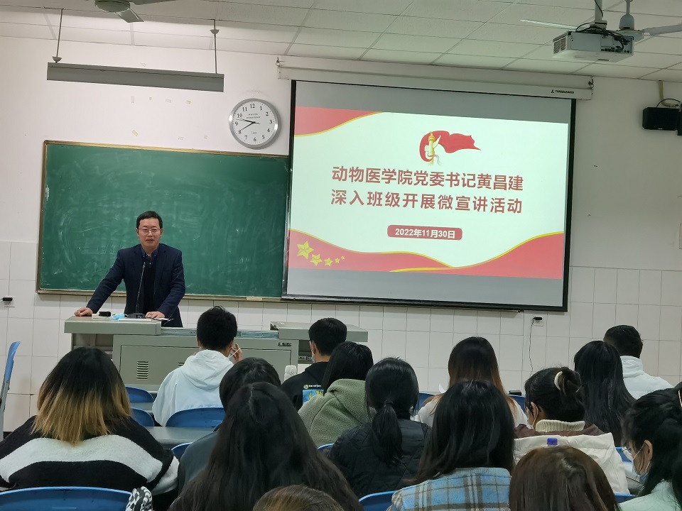 开展微宣讲,确保精神入脑入心。学院党委书记黄昌建深入2020级动物医学专业7班、8班,以学习宣传贯彻党的二十大精神为主题,用通俗易懂、简短精悍的语言进行了精准的解读。宣讲主题鲜明、紧扣实际、内容丰富,为同学们深刻理解、全面把握党的二十大精神提供了权威辅导。