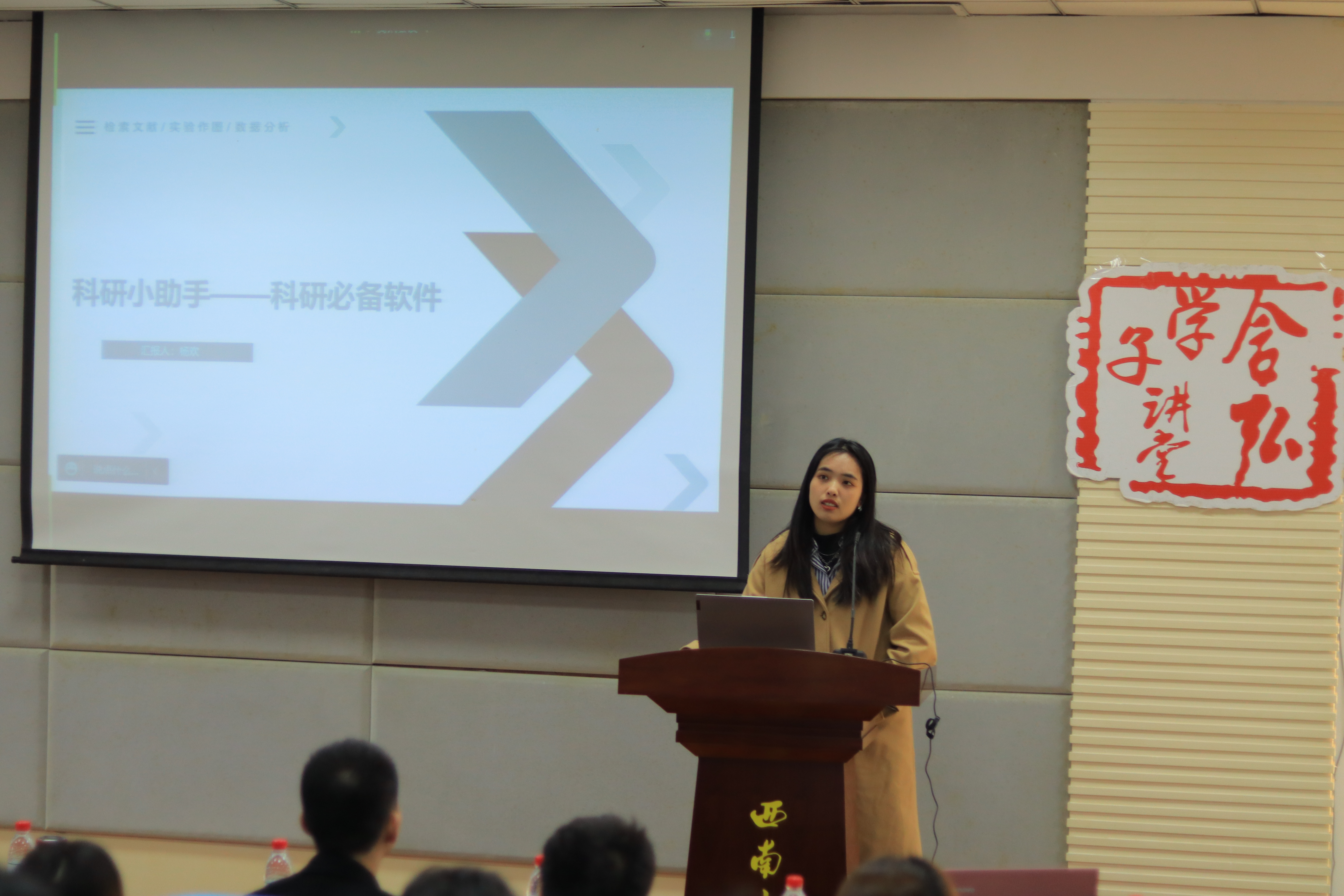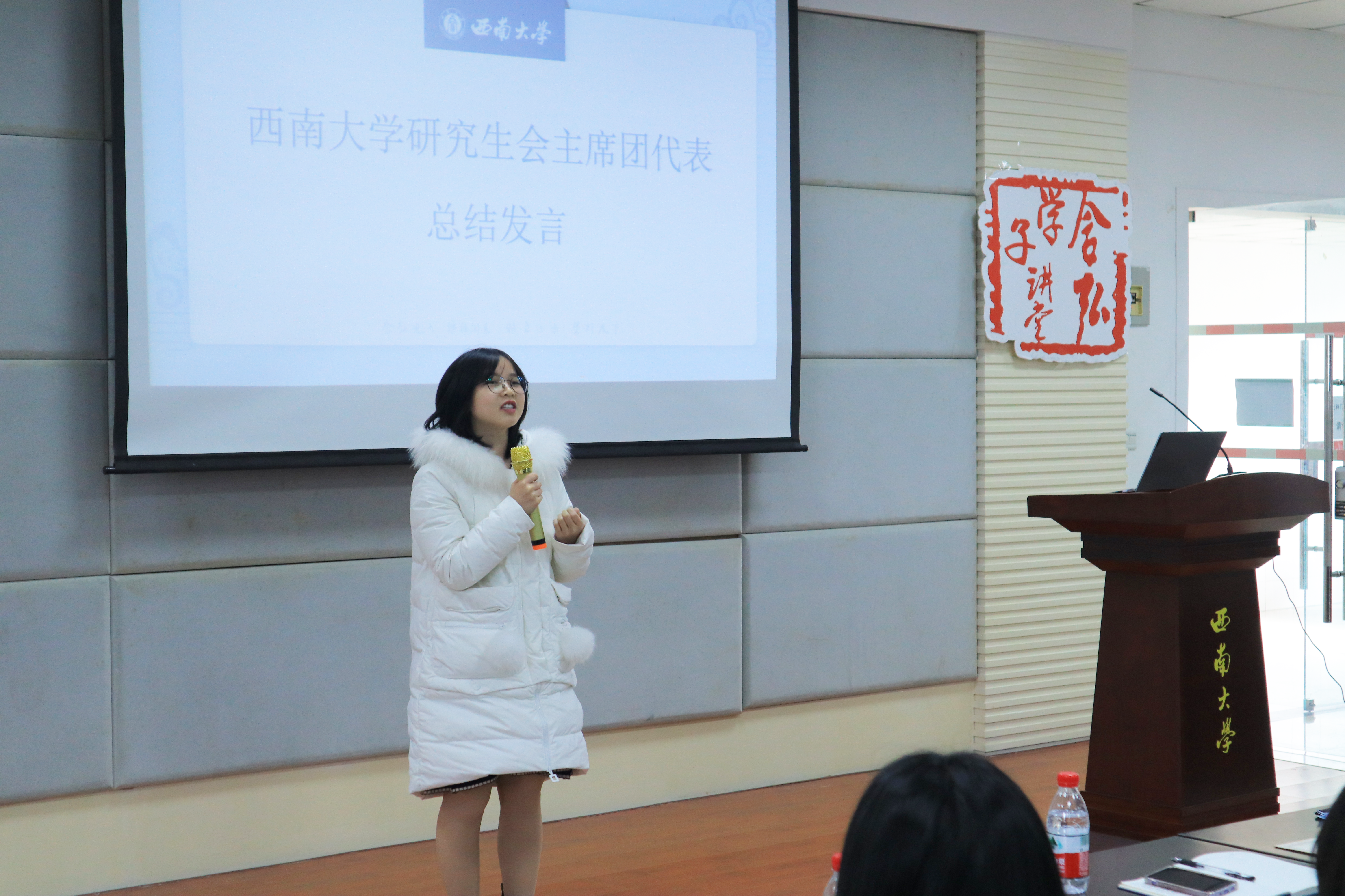 宣讲会最后,西南大学研究生会主席团代表张雨虹同学对本次科普知识宣讲会做总结发言。她对PA视讯集团积极承办含弘学子讲堂表示感谢,并表示含弘学子讲堂活动的举办为校院两级联动搭建了一个良好的学术交流平台,营造了良好的学术交流氛围,并期望广大研究生学子在科研路有所收获,为西南大学的学术科研添砖加瓦。