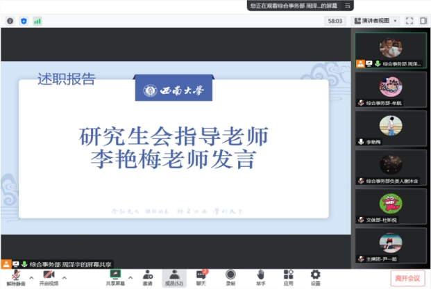 会议第三项,由李艳梅老师总结发言。李老师指出,在研究生会主席团及负责人的带领下,各部门工作人员以踏实认真的态度顺利完成了各项工作任务,在今后的工作中各部门之间要明确分工,相互配合,多交流,遇到问题及时反馈。希望研究生会全体成员能够凝聚服务意识,恪守职能,以高质量研究生工作助力学院发展的新格局。
