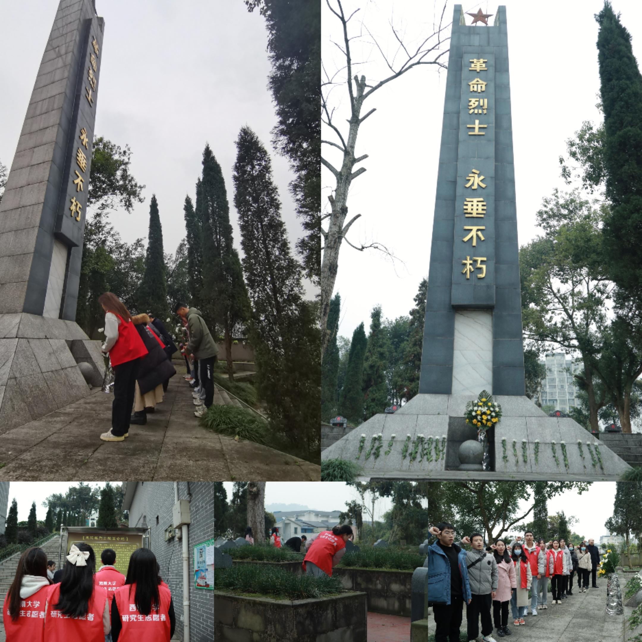 座谈会结束后,服务队来到重庆永川爱国主义教育基地——朱沱烈士陵园。走进陵园,队员们自发清扫园地落叶,并在老师们的带领下,向永垂不朽的革命烈士鞠躬献花。随后,全体党员同志在庄严的纪念碑下重温入党誓词。“今日的幸福来之不易,新时代的我们要了解历史,宣传历史,让身边更多人知史爱国。”研究生党员赵泽民同学说到。