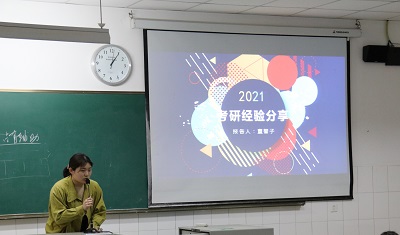为了帮助考研同学科学备考,合理安排时间,学院邀请了2021届考研成功的学长学姐现场分享考研经验,从复习准备过程、考研时间安排、考研科目复习经验等方面与学弟学妹展开交流。同时,学院公众号也推出了“研学旅行”栏目,通过采访本院研究生学长学姐,从考研目的、考验中遇见困难如何解决、考研资料选择、考研带来的变化等方面讲述考研心路历程,为学弟学妹提供帮助。