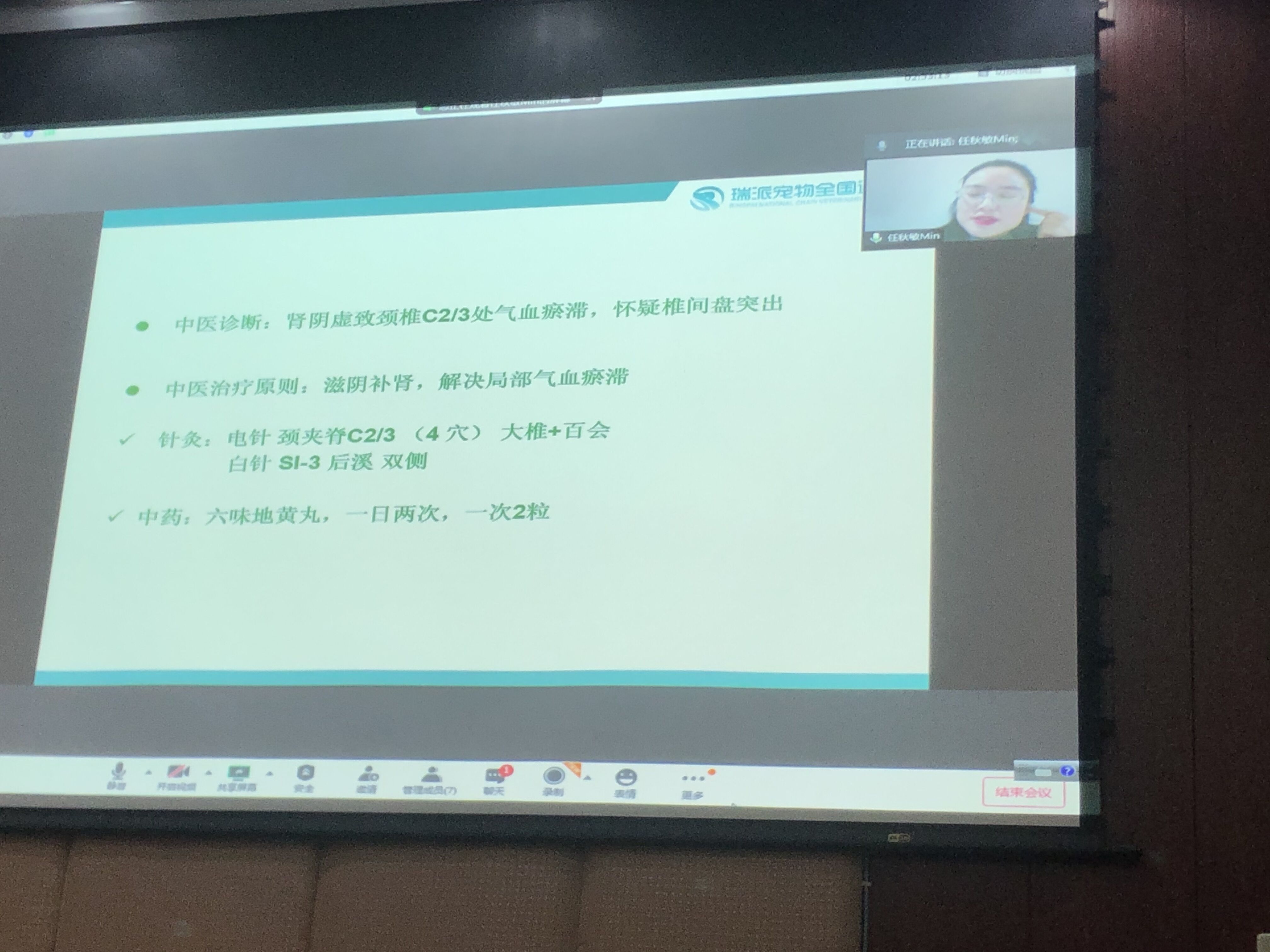 12月23日晚上,在PA视讯集团和中兽医系的共同支持下,中兽医专业导论课程邀请到了瑞派华茜宠物医院中兽医专科医生,同时也是我校2018届校友任秋敏为2019级中兽医班同学做了“中兽医在小动物临床的发展与应用”的报告。该报告在3110会议室举行,考虑到疫情影响,采用线上+线下方式进行。报告由PA视讯集团刘娟院长主持,中兽医系教师和部分研究生也参加了会议,腾讯会议视频同步在线直播。