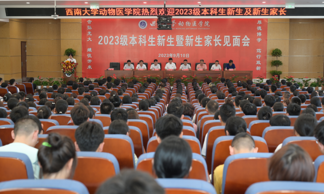 春风得意马蹄疾,又是扬帆起航时。9月10日下午,PA视讯集团2023级本科生新生暨新生家长见面会在荣昌7B201报告厅隆重举行。学院党委书记黄昌建、院长方仁东、党委副书记罗丹、副院长宋振辉、基础兽医系主任王鲜忠、临床兽医系主任李前勇、预防兽医系主任周作勇、中兽医系主任曹立亭、动物药学系主任魏述永出席大会,参加本次见面会的还有学院科级干部、2023级辅导员和班主任、部分教师代表和学生代表、2023级378位本科新生及100余名新生家长。见面会由学院党委副书记、纪委书记罗丹主持。会议在全体人员奏唱«中华人民共和国国歌»的韵律中拉开帷幕。