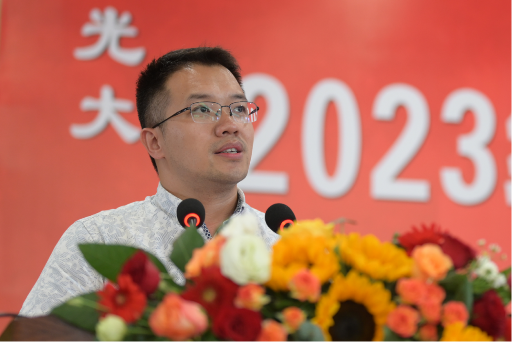 接着教师代表张龙祥老师进行发言。张老师介绍了自己的求学经历,他希望同学们夯实基础、树立目标、积极创新、懂得感恩,以赓续奋斗之势,续写壮丽宏图。