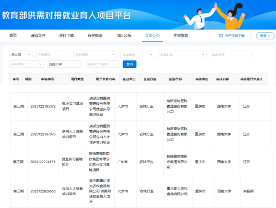 2024年6月14日,教育部高校学生司公布了第三期供需对接就业育人项目立项名单,由学院江莎老师、宋振辉老师牵头申报的与瑞派宠物医院管理股份有限公司、新瑞鹏宠物医疗集团有限公司和重庆正大农牧食品有限公司共建的定向人才培养培训项目、就业实习基地项目四个项目正式获批立项。