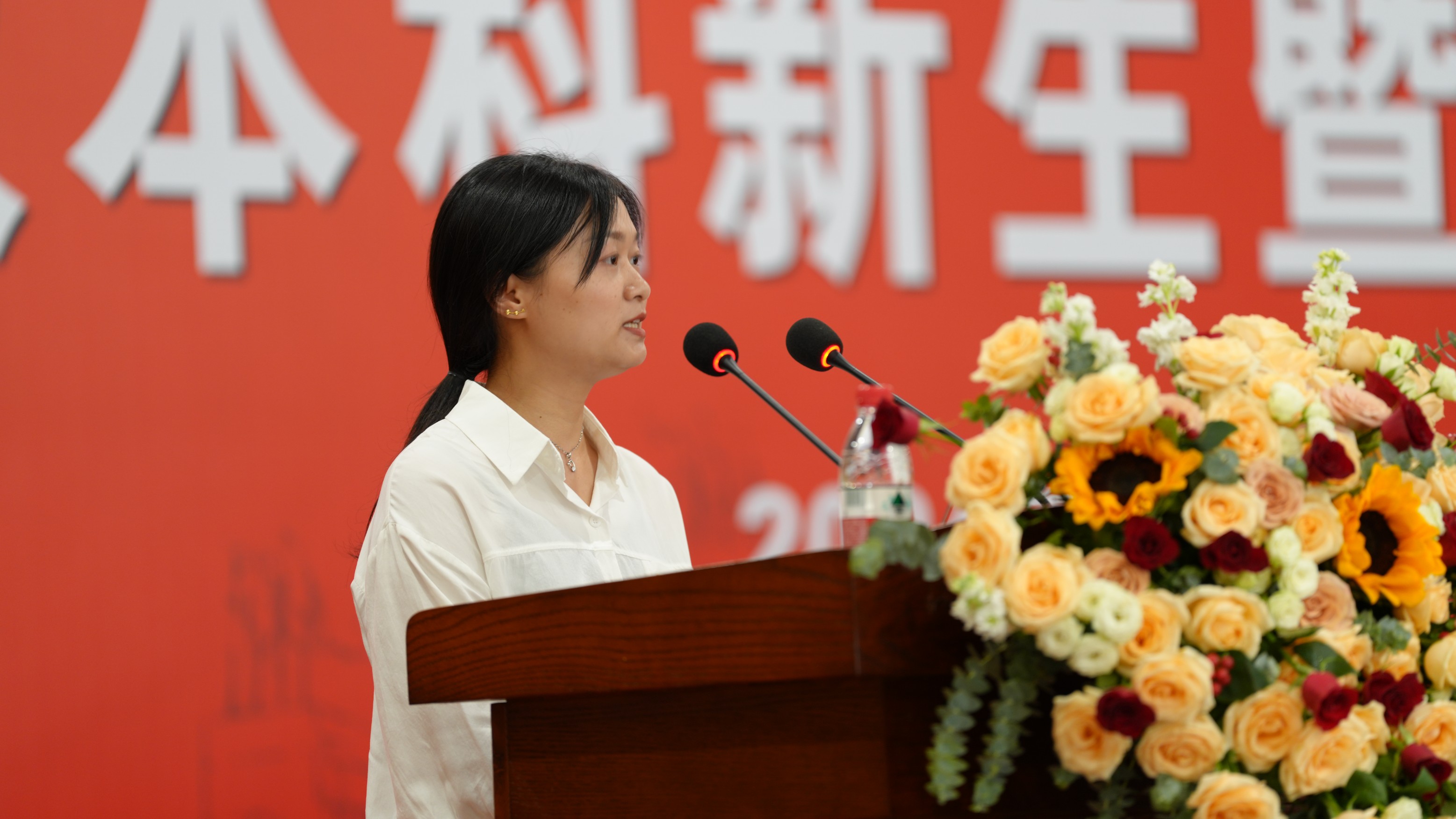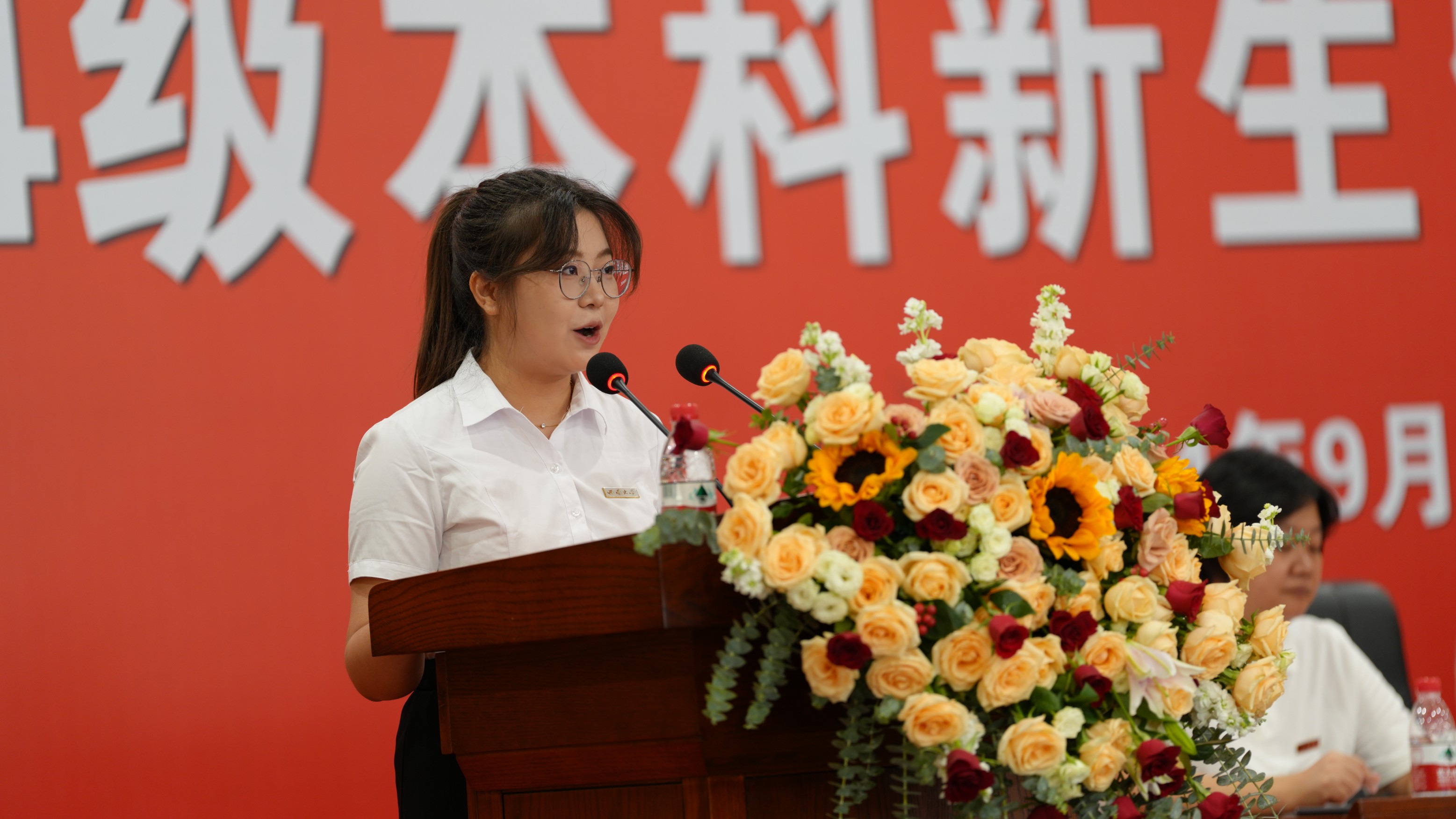 王梓蒙同学代表新生发言,她讲述了自己的奋进历程,并代表2024级新生进行了表态,坚定信念,步履不停,风雨兼程达心之所向,扶摇直上展似海前途,以青春之名,铸就时代之基。