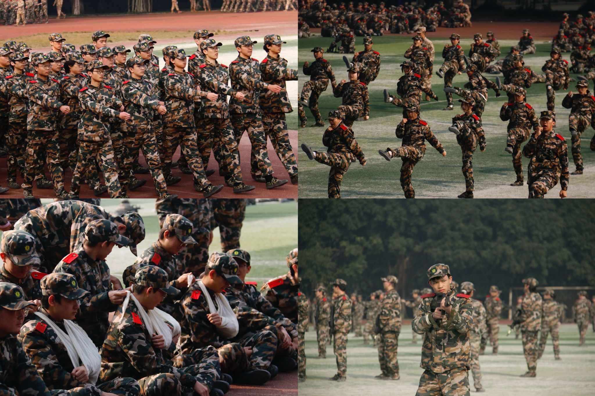 训练中,学院2024级全体本科生在教官的指导下进行站军姿、转体、敬礼、齐步走、三角巾及绷带的使用、头部及上肢的包扎等训练,这不仅增强了同学们的团队协作意识,更提高了他们的应急处理能力。后续,同学们分别加入了队列、擒敌拳、战术三大方阵进行分散练习,军训自此进入第二阶段。动医学子们在一拳一腿中体会那份热血豪情,努力成为有理想、有担当、有作为的新时代青年。