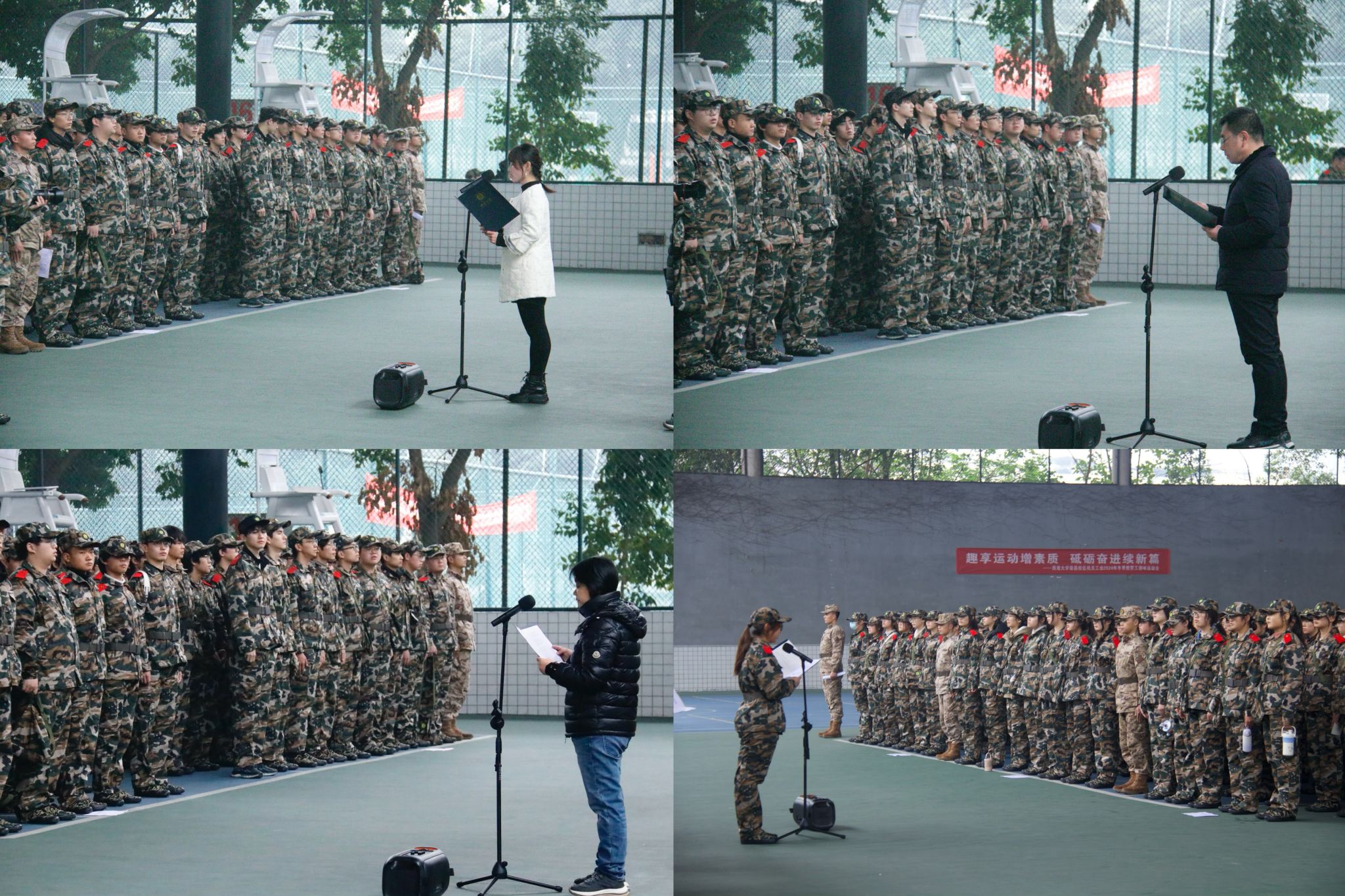 1月10日上午,学院于荣昌校区风雨球场举行军训总结大会,为期14天的冬季集中军训画上了圆满句号。大会在激昂的国歌声中拉开帷幕。2024级本科生王秉祺作为学生代表发言,他代表2024级全体同学向领导、老师、教官及后勤保障人员表达了诚挚的感谢,并分享了自己的深刻感悟。随后,三十五连连长高度肯定了学院参训学子的军训表现,在这14天的训练里,同学们全力以赴、坚韧不拔,充分展现出新时代青年学子昂扬奋进的精神风貌。仪式尾声,全体师生齐唱中国人民解放军军歌,激昂的旋律唱出了大家对本次集中军训的最后告别。