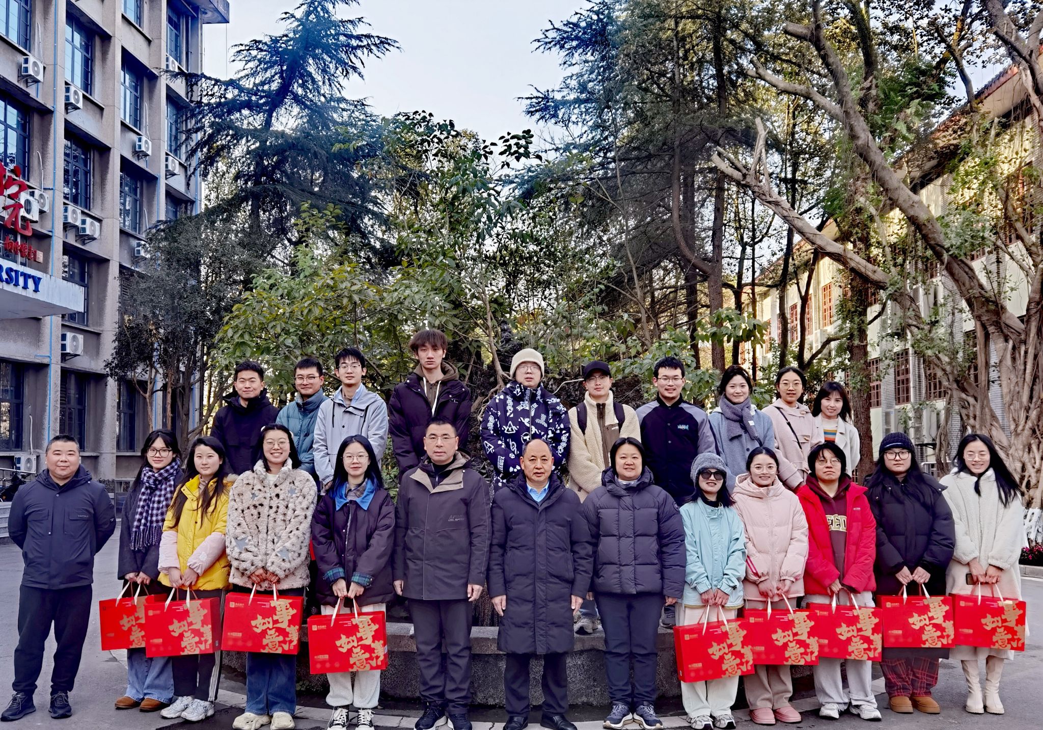 在荣昌校区,周国安、罗丹、宋振辉带着慰问品,为22名留校研究生、本科生送去新春问候和祝福,详细了解学生们留校期间的学习和生活安排,贴心地叮嘱大家,一定要注意身心健康,保持规律的作息,以更好的状态迎接新的一年;在北碚校区,研究生导师代表江莎与13名留校研究生、本科生深切交谈,并把准备好的新春礼物递到同学们的手中。每一份慰问礼物都承载着学院对学生的牵挂,同学们接过礼物,脸上洋溢着幸福的笑容。