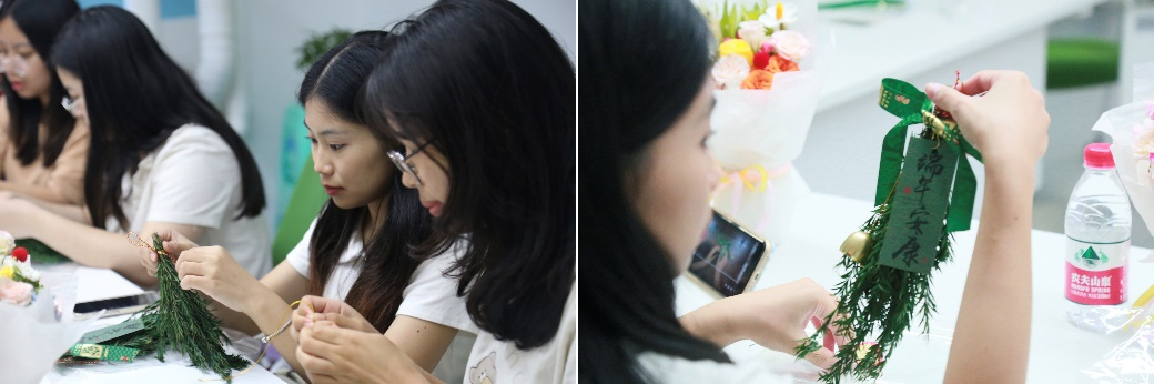 “粽香余韵,手作寄情”,中泰学生共同穿绳、系铃、缀花,制作端午门挂,以彩绳编织传承文化脉络,用饰物点缀传递民俗内涵,让端午 “辟邪纳福” 的美好寓意在手工制作中得以传承与展现,彰显出中华民俗文化的独特魅力。