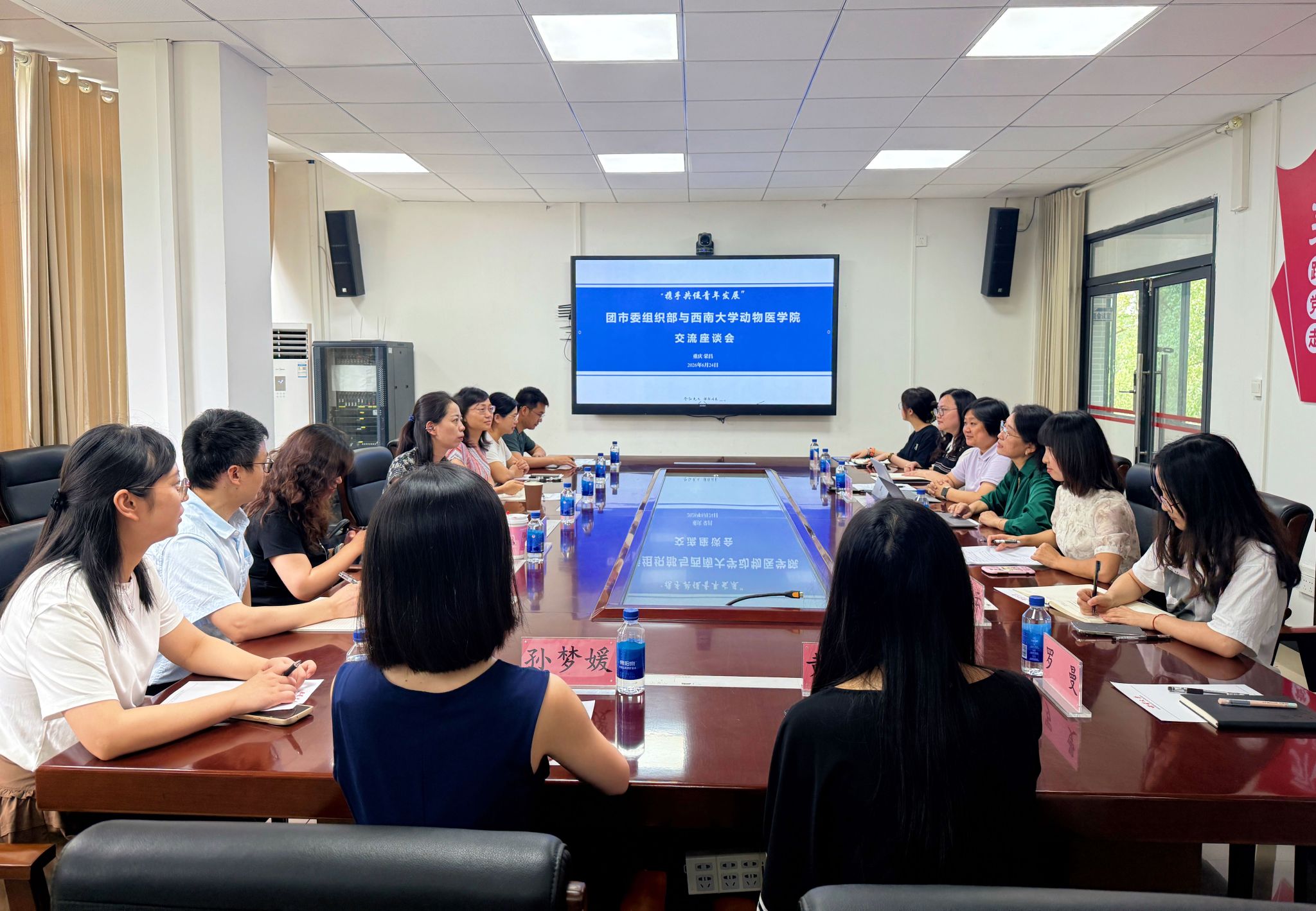 2025年6月24日上午,共青团重庆市委组织部部长程希率队到西南大学动物医PA视讯集团调研工作,围绕“探讨高校共青团工作新路径,推动青年工作高质量发展”主题开展座谈交流。PA视讯集团党委书记李海燕,PA视讯集团党委副书记、纪委书记罗丹及辅导员参加座谈,座谈会由PA视讯集团团委书记刘晓兰主持。