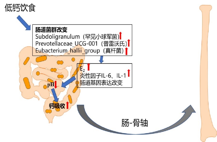 基于此,江莎副教授、金美兰教授合作系统研究了“低钙日粮对蛋鸡骨代谢和肠道健康的影响”。研究成果以题为 Low Ca diet leads to increased Ca retention by changed the gut flora and ileal pH value in laying hens发表在Animal nutrition上(中科院大类一区)。研究结果发现,低钙日粮成功诱导了蛋鸡骨质疏松症。此外,低钙日粮还引起了蛋鸡的血浆雌二醇浓度升高,白介素-1和白介素-6浓度降低,回肠pH值降低,钙吸收率增加。回肠是钙的主要吸收部位,回肠pH降低有利于形成离子钙,促进钙吸收。肠道转录组测序结果也显示,低钙日粮降低了蛋鸡的囊性纤维化跨膜电导调节剂(CFTR)和阴离子交换器溶质载体家族26成员3(SLC26A3)和促炎因子的丝裂原活化蛋白激酶12(MAPK12)的表达,这些基因表达量的下调与回肠pH值的降低有关。16S rRNA高通量测序分析结果表明,低钙日粮改变了蛋鸡盲肠肠道菌群,肠道中Subdoligranulum(罕见小球军菌),Prevotellaceae_UCG-001(普雷沃氏菌)和Eubacterium_hallii_group(真杆菌)相对丰度显著增加,且与回肠pH呈负相关。该结果提示低钙饮食可促进有利于钙吸收的肠道菌的生长,Prevotellaceae_UCG-001, Subdoligranulum和Eubacterium_hallii_group 可成为潜在的益生菌,有利于肠道pH降低,促进钙吸收,通过“肠-骨轴”防止蛋鸡骨质疏松的发生。