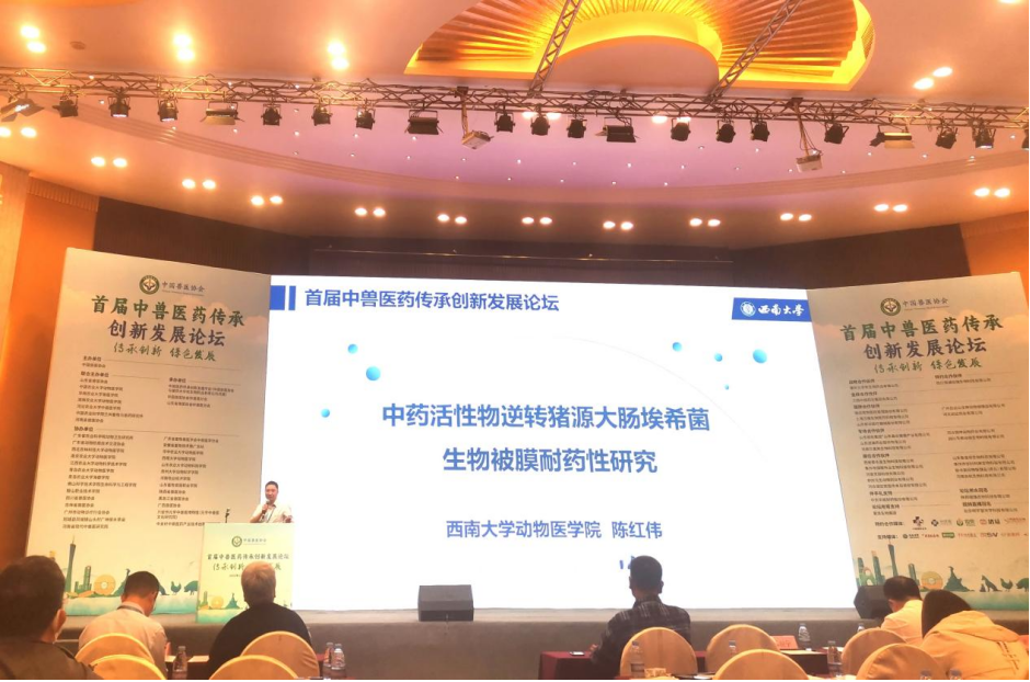 本次论坛设置“传承创新·绿色康养”、“中药资源·研发趋势”、“宠物诊疗·中兽医师”三个分会场,我院教师陈红伟副教授作为青年专家学者在“传承创新·绿色康养”专场做了《中药活性物逆转猪源大肠埃希菌生物被膜耐药性研究》的大会报告。会议现场处处洋溢着浓厚的学术氛围,来自全国各地的兽医从业者们对中兽医药的传承创新发展表现出浓厚的兴趣,学习热情高涨。