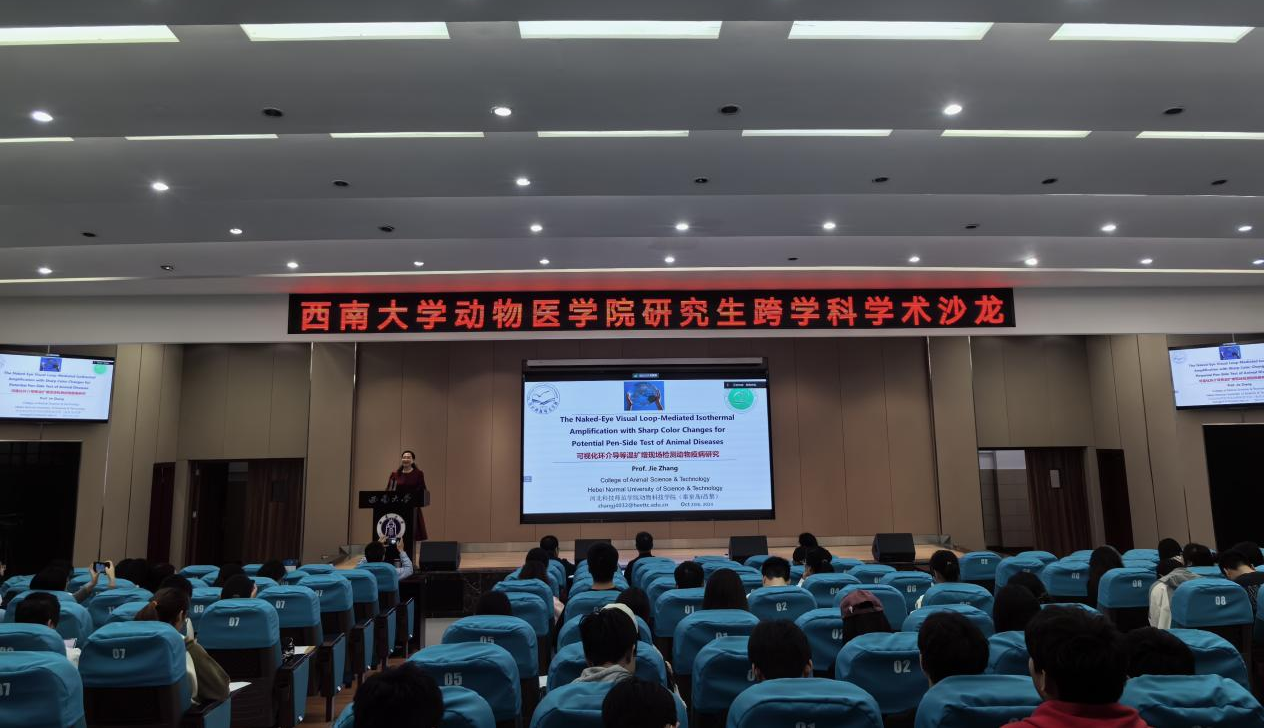 2024年10月25日,河北科技师范学院张杰教授、四川省开江县动物疫病预防控制中心欧云文研究员一行莅临学院开展学术沙龙。报告会由宋振辉副院长主持,黄庆州、陈红伟等教师代表参加学术交流,学院师生近200余人以线下和线上的方式参加此次学术沙龙。