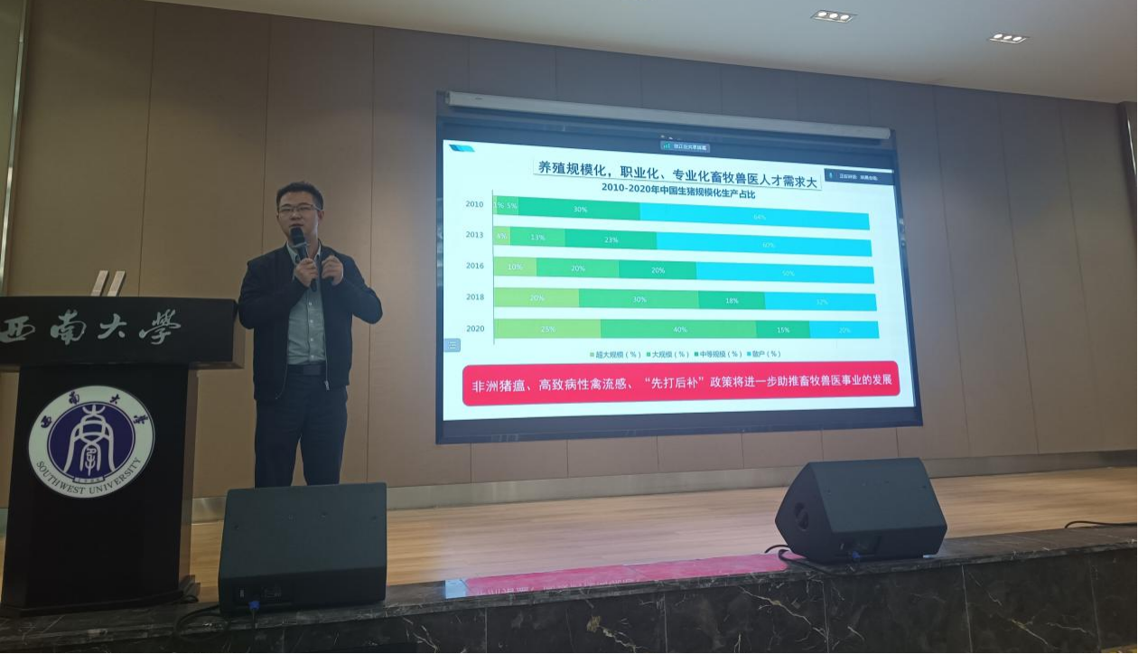 张杰以“The Naked-Eye Visual Loop-Mediated Isothermal Amplification with Sharp Color Changes for Potential Pen-Side Test of Animal Diseases”为题,就我国重要动物传染病、临床快检方法建立、产品合作研发及国际交流合作项目申报进行了深入交流,为在场师生提供了宝贵的学术洞见。我院2009级校友欧云文以“青春在服务乡村振兴中闪光”为题,介绍其学习工作经历、科研之路、创新创业大赛、技能大赛与兽医临床技术服务等宝贵经验,极大地激发了同学们的热情,坚定了同学们继续深造兽医专业的决心。